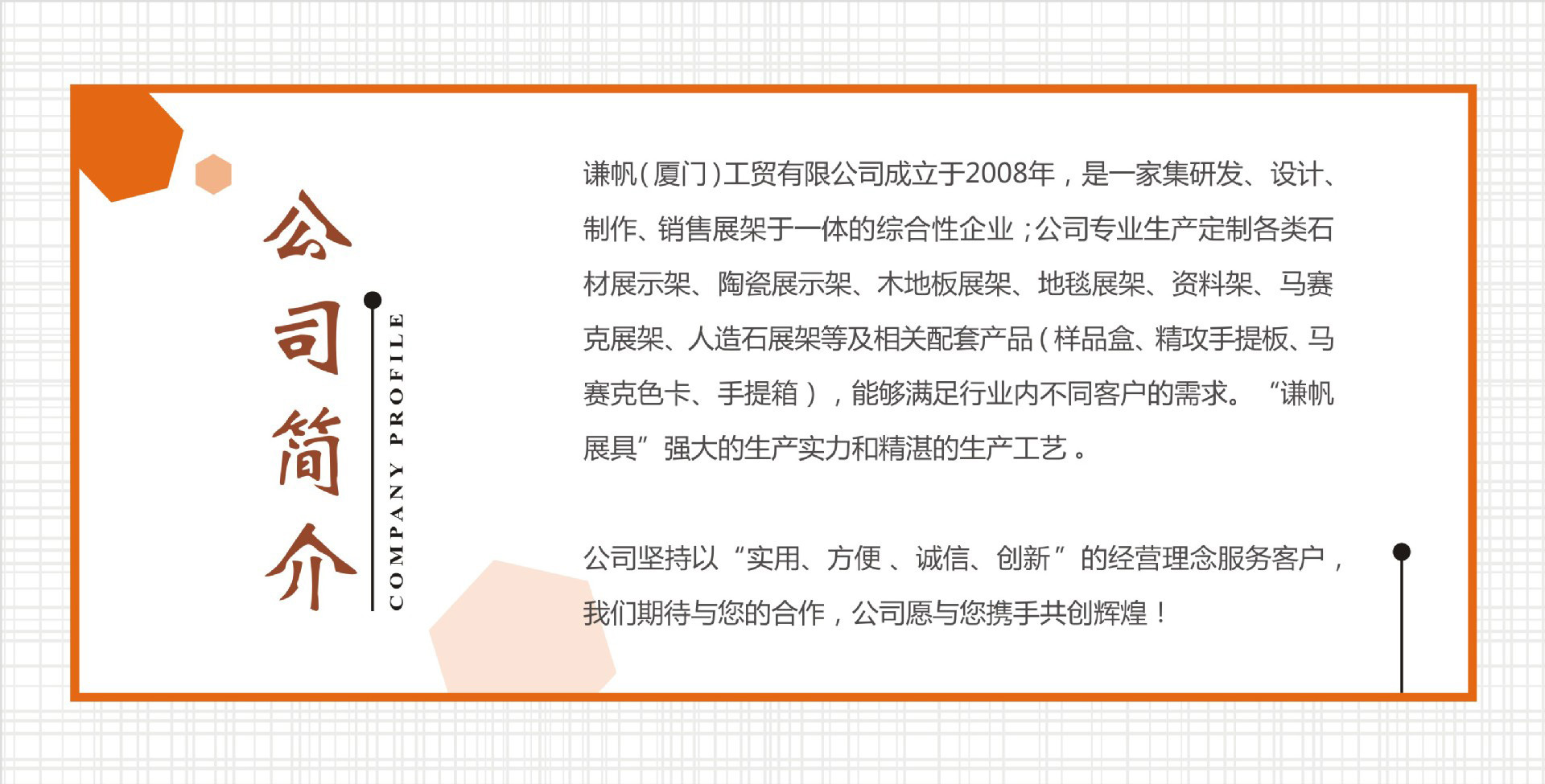 谦帆(厦门)工贸有限公司成立于2008年3月,是一家集设计、制作、印刷于一体的综合性企业,工厂占地3000多平方,专业生产石材展示架、陶瓷展示架、木地板展架、资料架、马赛克展架、人造石展架各类展示架及高档样品盒、精攻手提板、马赛克色卡、木礼品盒、手提袋、有机玻璃手提板,各类大、小展架等,品种繁多,能够满足广大客户不同的需求,强大的创新能力,简约的设计风格,精湛的生产工艺,成为海内外客户的信赖品牌。